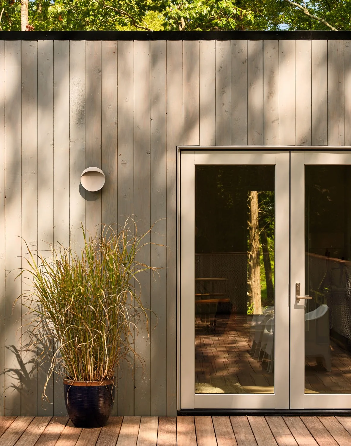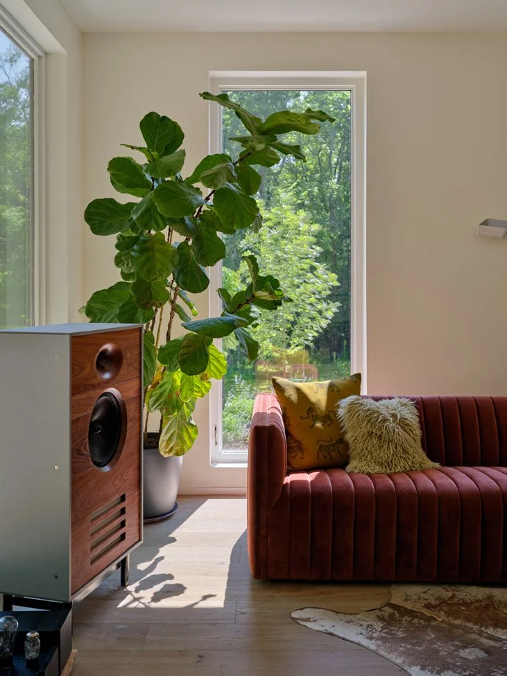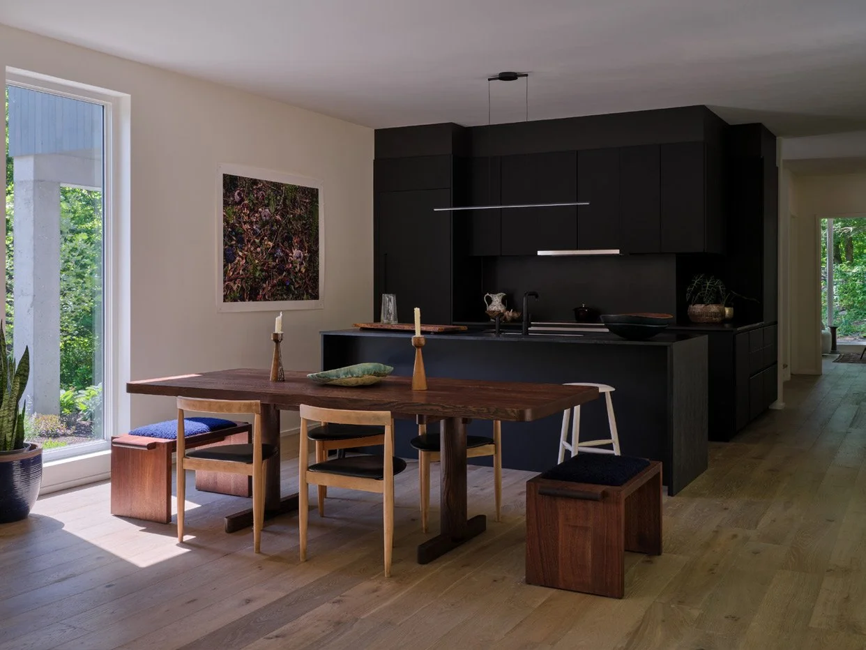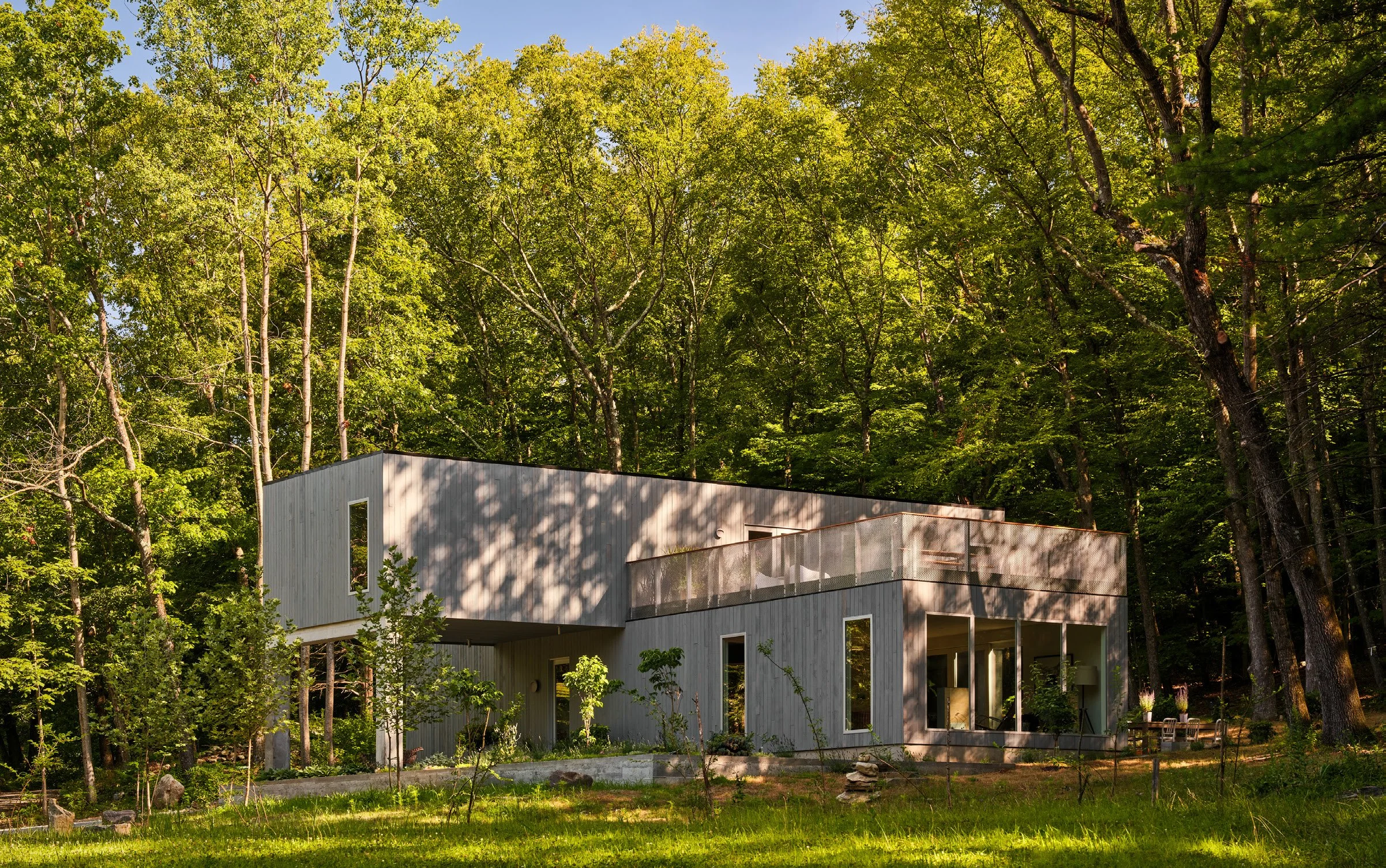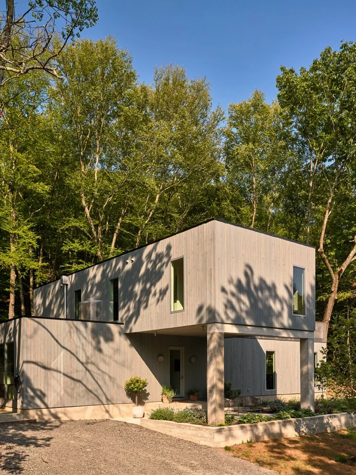 The second house applied lessons and refined solutions while continuing to explore the possibilities of the rural townhouse; this time with a front pavilion, screened in porch, and expansive deck floating in the canopy. City-smart efficiency meets forest living – compact, vertical, and designed to frame the seasons.