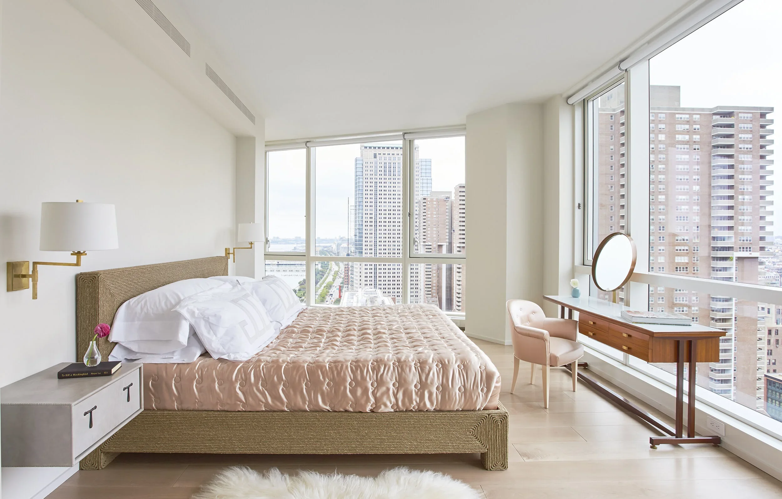 A young family dreaming of beach trips inspired this project. Here the cityscape is the vast ocean and their pastel aerie overlooking it is beach house high modern, practical and luxurious.